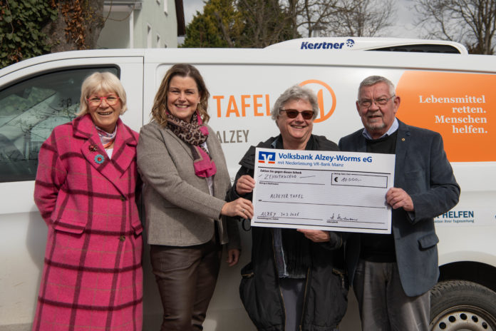 Die Tafel Alzey besteht seit 2007 und wurde von der Arbeitsgemeinschaft christlicher Kirchen in Alzey und Umgebung gegründet. Rund 100 Ehrenamtliche engagieren sich dort regelmäßig. Sie versorgen mehr als 1.000 Menschen mit Lebensmitteln, die von Supermärkten, Produzenten, Großhändlern und Bäckereien gespendet werden.