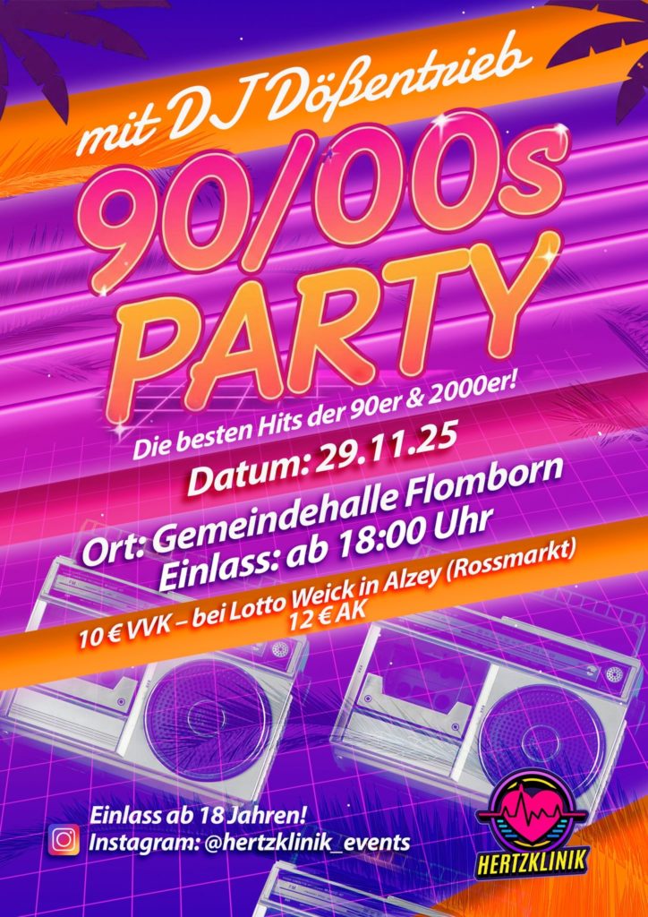 Flomborn bekommt eine neue Eventreihe: Am 29. November 2025 startet die erste 90er/2000er-Party in der Flomborner Halle. Einlass ist ab 18 Uhr, Zutritt ab 18 Jahren. Für den Sound sorgt DJ Dößentrieb, der den gesamten Abend mit den prägenden Hits zweier Jahrzehnte ausstattet.