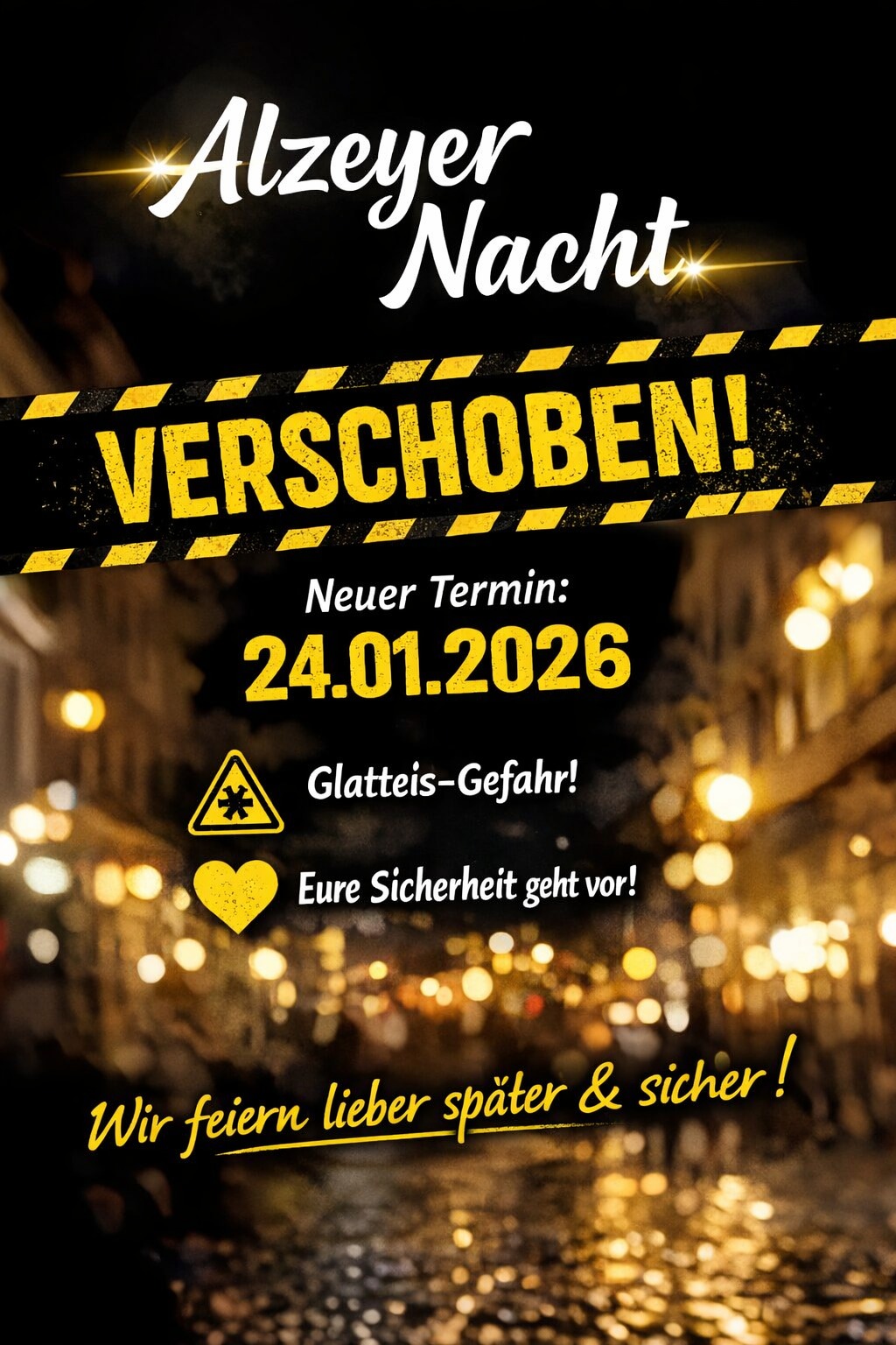 Die Alzeyer Nacht wird um zwei Wochen verschoben und findet nun am Samstag, 24. Januar 2026, statt. Am Konzept der Veranstaltung ändert sich nichts. Geplant sind weiterhin volle Kneipen, Musik, Begegnungen und ein gemeinsamer Abend in der Alzeyer Innenstadt.
