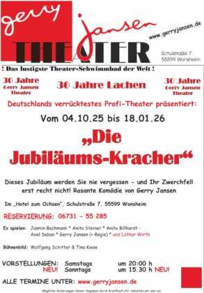 Wer die Premiere verpasst hat, kann beruhigt sein: Das Jubiläumsprogramm läuft noch bis zum 18. Januar 2026, jeweils samstags um 20.00 Uhr und sonntags um 15.30 Uhr im Wonsheimer Kulturbecken, das im Hotel Zum Ochsen integriert ist.