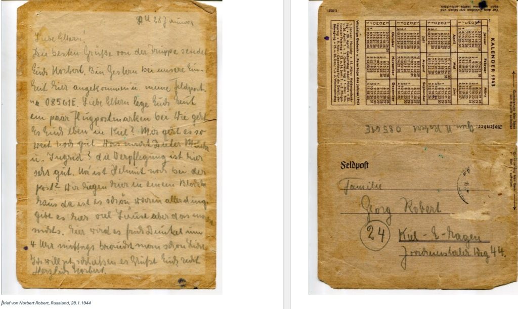 Norbert Robert, der in Grünstadt eine Lehre als Buchdrucker begann, wurde Ende 1943 zur Wehrmacht einberufen. Aus der Bergmannskaserne in Wentorf bei Hamburg sandte er am 7. Dezember 1943 seinen letzten überlieferten Brief an seine Eltern Georg und Hedwig.