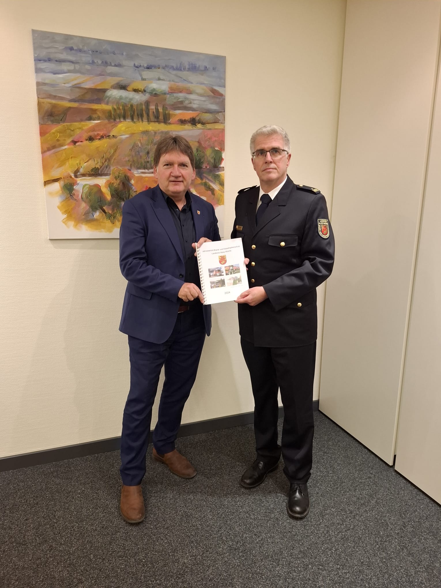 Brand- und Katastrophenschutzinspekteur Michael Matthes übergibt Landrat Heiko Sippel den Jahresbericht 2024. Fotoquelle: Kreisverwaltung Alzey-Worms
