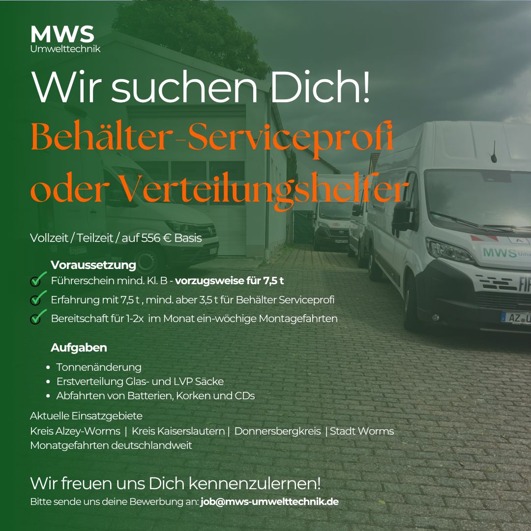 MWS Umwelttechnik in Alzey sucht ab sofort Mitarbeiter für den Behälterservice und/oder Verteilungshelfer. Der Einsatz erfolgt werktags von Montag bis Freitag im regionalen Bereich; zusätzlich fallen regelmäßig Montagetouren an. Für diese Touren werden Verpflegung und Bonuszahlungen gestellt.