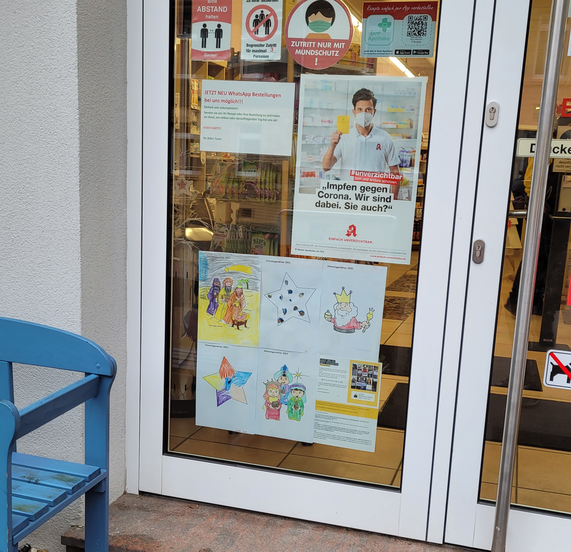 Die Sternsinger in Weinheim haben hierzu Flyer mit entsprechenden Informationen und Segensaufkleber an alle Haushalte verteilt. Spenden sind per Überweisung oder über die aufgestellten Spendendosen in der Bäckerei, beim Metzger und in der Apotheke möglich.
