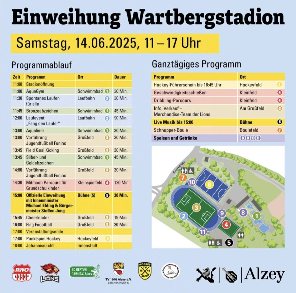 Gegen 17 Uhr endet das Stadionfest, aber der Tag ist noch nicht vorbei: Direkt im Anschluss geht’s weiter mit der Johannisnacht des HSV Fördervereins auf dem Rossmarkt. Wer also noch Lust auf Musik und Feierstimmung hat, zieht vom Wartberg in die Innenstadt.„Das neue Wartbergstadion ist ein starkes Zeichen für unsere Stadt: modern, offen und voller Leben. Wir haben hier eine Sportstätte geschaffen, die Alzey gut tut – und die wir gemeinsam mit unseren Vereinen weiter mit Leben füllen wollen“, so Bürgermeister Steffen Jung. „Dieses Fest ist auch ein großes Dankeschön an unsere Alzeyer Vereine, die mit unglaublich viel Engagement dabei sind – nicht nur an diesem Tag, sondern das ganze Jahr über. Ich lade alle Vereinsmitglieder, Ehrenamtliche und natürlich alle Bürgerinnen und Bürger ganz herzlich ein, diesen besonderen Tag gemeinsam zu feiern und im neuen Wartbergstadion auf Entdeckungstour zu gehen.“